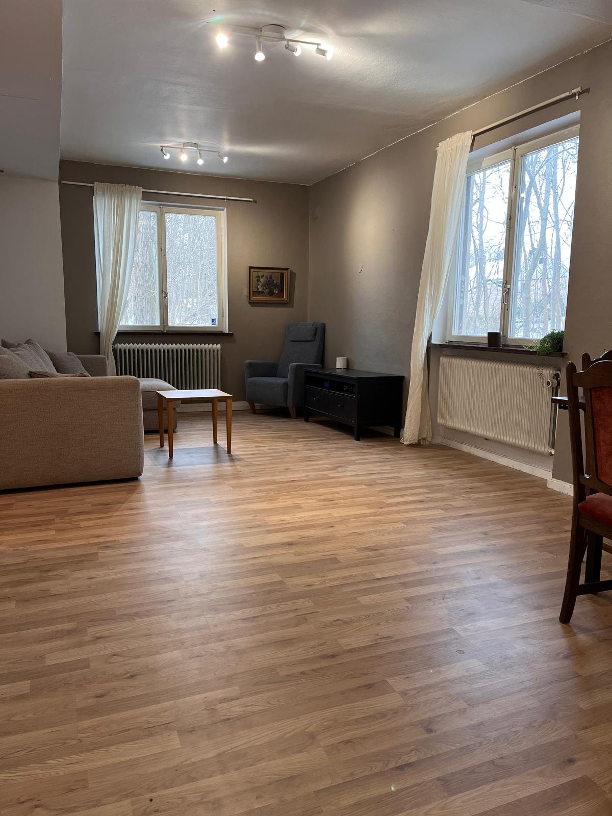 Nu ska vi hyra ut lilla lägenheten i vårt hus. Lägenheten ligger på bottenvåningen och är med en privat ingång på baksidan av huset. Hela lägenheten har en takhöjd på 2,7 m och har fönster på två sidor (N & V). Eftersom vi bor själv i huset lägger vi vikt vid att hitta rätt person som vi känner oss bekväma med att bo så nära oss och våra barn. Det som ingår i hyran: internet, vatten, avlopp, värme, sophämtning. Vi kan hyra ut lägenheten med möbler om så önskas. Vi kan vara villiga att tillåta husdjur om vi gillar dem och du är försäkrad. Lägenheten är rökfri. Planlösning: Första rummet är entrén var man också går in till duschrummet. Innan entrén ligger sen en bred hall till höger med WC, tvättstuga och skåp, sovrum till vänster och vardagsrum med kök rakt fram. Entrén: Lackerade golv, garderob och skoskåp. Duschen: Walk-in-shower med epoxi golv + vask med spegelskåp. Hallen: Nytt vattentåligt laminatgolv. Bred med plats till förvaring. Stor skåp + el central. WC: Epoxi golv, stor diskho, spegelskåp. Tvättstugan: Tvättmaskin + torktumlare. Sovrummet: Stort (16 m2) med två fönster, laminatgolv och garderob. Vardagsrum / kök : Ca 40m2. Fönster på två sidor. Nytt vattentåligt laminatgolv. Spis, fläkt, kyl/frys, mikro.